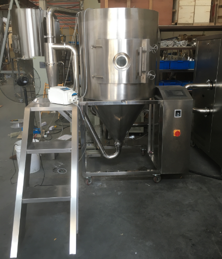 制備出真正的圓球狀實心微球顆粒,首選實驗可用上海歐蒙生產的OM-5000型實驗型噴霧干燥機。實驗型噴霧干燥機系統工作流程如圖所示。該系統的工作原理是空氣經過電加熱以后,再通過高溫過濾器,以保證進人塔體的空氣是潔凈熱空氣,然后通過干燥室頂部的熱風分配器,通過熱風分配器的熱空氣均勻地進人干燥室內并呈螺旋狀轉動,同時將料液送至離心噴霧頭。鋁礬土料漿被高速旋轉的噴霧頭噴射成球形霧滴,水分迅速在霧滴表面蒸發,在極短的時間內,霧滴干燥收縮成為微球坯體。較粗的微球顆粒由干燥室底部的收集桶收集,較細的微球顆粒通過設在錐底的管道流到旋風分離器,并由套在旋風分離器底部的收集桶收集。廢氣通過除塵器排出。