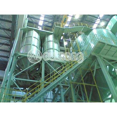 除塵系統由高效旋風分離器、布袋除塵器、離心風機等組成。抽風機將較細的顆粒料與干燥空氣一起送入高效旋風分離器。經過有效分離,較細顆粒料進入分離器底部的收集筒回收,所剩的含有極少量微細顆粒料的廢氣由離心風機吸入布袋除塵器經過再次除塵收集,實現了廢氣的無害化處理,最后的廢氣從煙囪排出。