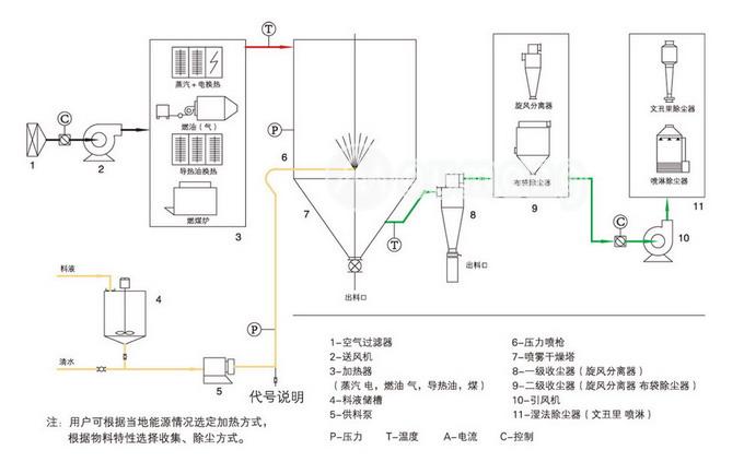 壓力式噴霧造粒干燥機主要由供料系統、干燥系統、除塵系統、加熱系統和電器系統組成,而每一系統又包括一些相關設備。